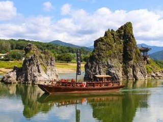단양 가볼만한곳 베스트 10 일곱 번째! 단양에서 영춘면으로 가는 길은 남한강을 내내 끼고 달리며, 때로는 강가의 기암절벽이 시선을 압도하기도 하는 대단히 빼어난 드라이브 코스이다. 영춘면으로 들어서는 길목에서 방향을 틀어서 구인사로 향하다가 보면 거대한 기와의 물결이 화려한 온달관광지의 입구에 오른다.