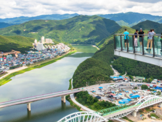 단양 가볼만한곳 베스트 10 여덟 번째! 만학천봉전망대는 원형으로 만들어져 소백산과 금수산 그리고 월악산 등 백두대간 명산들을 동서남북의 사면으로 감상할 수 있으며, 남한강 수면 위 약 80m 높이에 전망대 맞은편 남한강을 향하여 삼지창 모양으로 삐져나와 있는 하늘길에 올라서고 나면 남한강의 절경이 한눈에 들어오고 마치 구름 위를 걷는 듯한 아찔함을 경험해볼 수 있다.