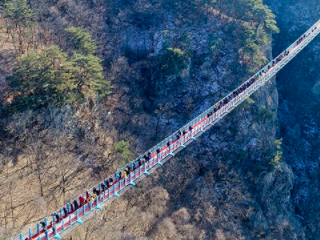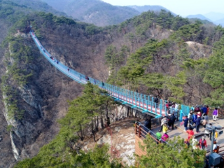 원주 가볼만한곳 베스트 10 첫 번째! 산악보도교는 산행의 편의를 위해 설치한다. 끊긴 등산로를 잇고 험로의 안전을 확보를 하는 것이 산악보도교의 존재 이유이다. 경기 파주 감악산의 출렁다리, 경북 봉화의 청량산의 하늘다리, 전북 진안의 구봉산의 구름다리 등 우리나라의 대표 산악보도교 대부분이 그러한 목적으로 설치됐다. 하지만 원주 소금산 출렁다리는 약간 다르다. 출렁다리가 있는 소금산 암벽 봉우리의 스카이워크 전망대에서는 섬강의 빼어난 풍광을 감상해볼 수 있다는 것이 그 특징이자 매력이다.