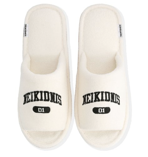 층간소음 해결 예쁜 거실화 슬리퍼 추천 여섯 번째! 푹신한 느낌의 네이키드니스 룸 슈즈는 부드러운 타월 소재로, 피부 자극을 최소화한 제품이다. 편안한 아이보리 색상, 혹은 세련된 블랙 색상을 베이스로 삼고 있으며, 중앙에는 대비되는 색상으로 바시티 로고가 자수로 새겨져 있다. 제품은 코튼 85%, 폴리에스터 15%의 재질로 이뤄져 있다.