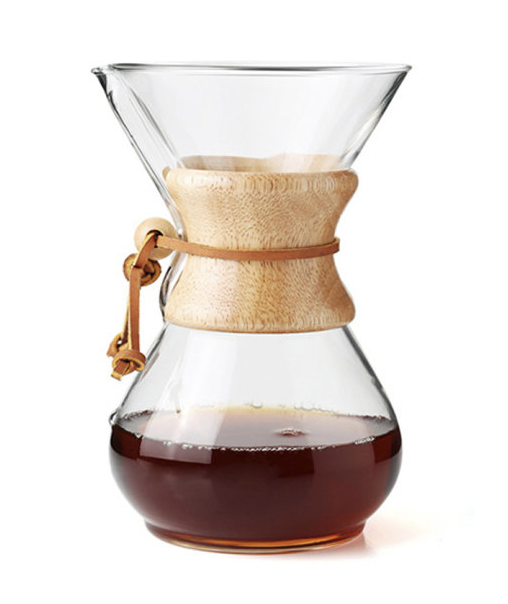 홈카페를 위한 커피 머신 도구 추천템 여섯 번째! 케맥스는 가장 단순한 형태의 커피 추출 기구로, 출시 후부터 지금까지 오랫동안 사랑받고 있다. 실험실의 비커를 연상케 하는 유리 서버와 나무 손잡이가 이 기구의 전부다. 케맥스는 일반적인 핸드 드립처럼 커피에 물을 부어 내리는 방식이지만, 면으로 만든 케맥스 전용 필터를 사용해 쓴맛이 훨씬 적고 부드러운 맛이 도드라지는 것이 특징이다. 다만 기구 전체를 유리로 만들었기 때문에 깨지기 쉬운 것이 유일한 단점이다.