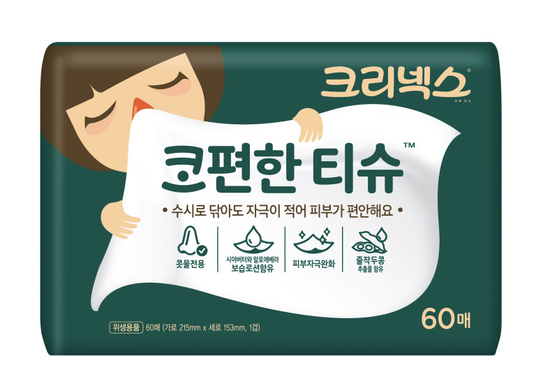 친환경 화장지 티슈 종류 비교 추천 두 번째! 자주 코를 닦다 보면 코 밑이 헐고 피부가 따갑기 마련인데, 콧물이 자주 나는 비염, 알레르기, 감기 환자들의 불편을 완화해줄 수 있는 전용 휴지가 출시되어 있다. 크리넥스 코편한 티슈는 콧물 전용 티슈로, 시어버터와 알로에베라 보습로션이 함유되어 촉촉하며 비염에 좋은 줄 작두콩 추출물까지 함유했다. 도톰하고 물에 강한 코폼 원단으로 한 장이면 충분히 코를 풀 수 있으며 손에 묻을 염려가 없다.