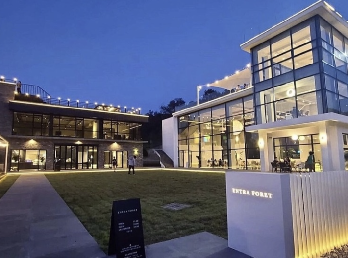 해외 부럽지 않은 전국 이국적인 SNS 핫플 카페 두 번째! 충청북도 청주시 외곽에 있는 ‘엔트라포레’는 두 개의 건물로 이뤄진 대형 카페로, 두 개 건물은 각각 블랙과 화이트의 상반된 분위기의 테마로 운영되고 있다. 건물 옥상에는 루프톱 좌석이 있어, 탁 트인 풍경을 즐길 수 있다. 낮에 보는 풍경도 매력적이지만, 건물 전체에 은은하게 배치된 아름다운 조명을 즐기기 위해 밤에 방문해보는 것도 좋은 선택이 될 것이다.