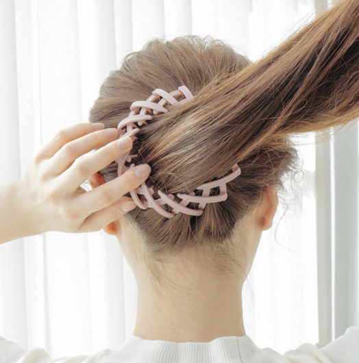 헤어 액세서리 연출 아이템 종류 일곱 번째! 일명 똥머리 고정밴드라 불리는 이 제품은 빗살이 지그재그로 짜여져 있는 듯한 신기한 모양에 줄었다 늘었다 하는 신축성도 뛰어나 올림머리는 물론 로우테일, 반묶음 등 다양한 스타일링을 할 수 있다. 만두슈슈를 늘려 가운데에 머리를 끼우고, 빗살이 안쪽 머리에 닿게 원하는 높이에 위치시킨 뒤 빗살 전체를 조여주기만 하면 10초 만에 스타일링이 완성된다.