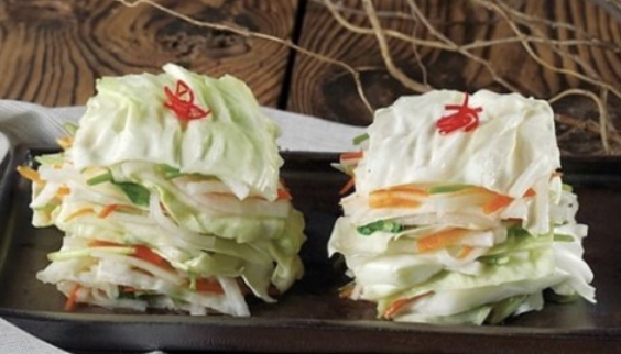 위 건강을 위한 양배추 맛있게 먹는 방법 여덟 번째! 배추김치로 김치를 만들어 먹는 게 일반적이지만, 양배추로도 맛있는 김치를 만들 수 있다. 오히려 배추김치보다 아삭아삭 씹히는 맛이 좋고 확연히 다른 매력이 있다. 양배추 1/2통, 당근 2/3개, 무 1개, 미나리 10줄기, 양파, 물, 찹쌀가루, 굵은 소금을 준비한다. 양배추는 한 잎씩 떼어내어 소금물에 절인 뒤 물기를 털어준다. 당근과 무는 채 썰고, 미나리도 4cm 길이로 썰어준다.