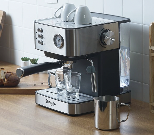 가정용 에스프레소 커피머신 브랜드 가격 종류 순위 비교 추천 일곱 번째! 10만 원 중반대의 저렴한 가격대에 포진한 맥널티의 커피머신도 추천할만하다. 세련된 메탈 재질과 슬림보디 디자인을 채택한 제품으로, 주방에서 많은 공간을 차지하지 않는 커피머신이다. 15BAR의 고압력으로 커피를 추출할 수 있으며, 트립 트레이드는 분리할 수 있어 세척이 간편하다, 물탱크는 분리형으로 최대 1.2L까지 물을 미리 담아놓을 수 있다. 내부 압력은 클래식한 아날로그 압력 게이지로 확인할 수 있다.