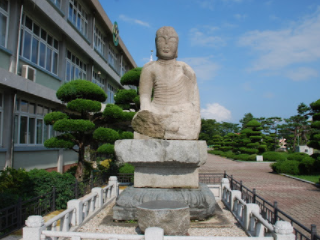 함양 가볼만한곳 베스트 10 두 번째! 이 불상은 현재 함양중학교 경내에 위치해 있는 고려시대의 석불좌상이다. 대좌 높이까지 포함하여 약 4m가 넘는 거대한 조각으로서 풍화의 작용으로 파손이 심각한데도 불구하고 여전히 웅장한 느낌을 준다. 불상은 전체적으로 마멸이 심한데 얼굴과 오른쪽 손, 무릎 및 대좌의 일부가 깨져 있다. 머리부분이 마멸되어 꼭지부분은 분간할 수가 없을 정도이지만 음각된 눈썹과 두툼한 입술,풍만한 턱은 불상의 원형을 짐작하게끔 한다.