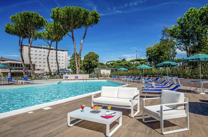이탈리아 로마 여행 숙소 호텔 추천 다섯 번째! 이 호텔은 지하철 B노선 EUR 페르미 역에서 709, 700, 70번 버스를 타시면 가실 수 있습니다. 레오나르도다빈치공항에서 차로 약 20분이 소요되며, 주변 관광명소로는 차로 약 20분 거리에 로마 최대의 랜드마크인 콜로세움, 고대 로마의 중심가였던 포로로마노와 팔라티노 언덕, 미켈란젤로가 설계한 아름다운 캄피톨리오 광장이 자리하고 있습니다. 또한, 약 35분 거리에는 바티칸 시국이 있습니다.