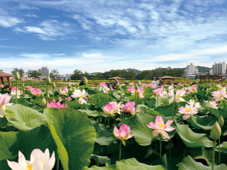 함안 가볼만한곳 베스트 10 네 번째! 아라가야 왕궁지 앞에 조성이 된 연꽃테마파크는 700년 전 고려시대의 연꽃인 아라홍련과 경복궁 연못에 복원되어서 우리나라 최고의 자생 연꽃임이 입증이 된 법수홍련 등 50여종의 다양한 연꽃을 감상해볼 수 있는 곳이다.