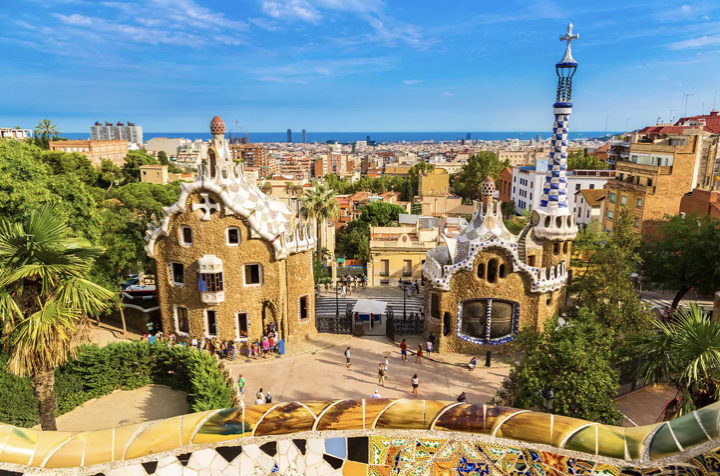 유럽 자유여행 스페인 바르셀로나 가볼만한곳 관광 명소 추천 다섯 번째! 원래 가든 시티로 구상된 구엘 공원은 안토니 가우디의 초현실적이고 고도로 상징적 예술을 선보이는 공공 공원이에요. 이 공원은 언덕 꼭대기에 자리 잡고 있으며 바르셀로나의 탁 트인 전망을 볼 수 있는 곳이기도 해요. 다채로운 모자이크와 넓은 테라스 같이 가우디의 시그너처 터치가 곧곧에 흩어져 있죠.