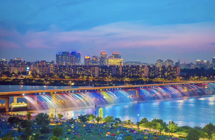 서울 여행 출사 사진찍기 좋은곳 전망 풍경 경관 아름다운 핫플 명소 추천 베스트 여덟 번째! 용산구와 서초구를 연결하는 반포대교는 한국 최초의 2층 교량이에요. 반포대교 아래에 잠수교가 있는 이곳은 최적의 위치와 아름다운 야경으로 수많은 이들의 사랑을 받고 있어요. 반포대교 1,140m 구간에 설치된 달빛 무지개 분수는 한강의 특징인 넓은 강폭이 돋보이도록 낙하용 수중 펌프를 이용해 멋진 장면을 연출해요.