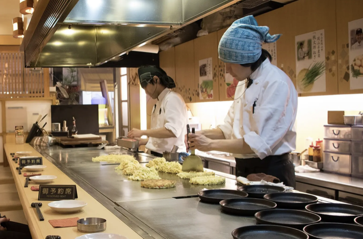 일본 여행 맛집 먹거리 요리 추천 베스트 일곱 번째! 오코노미야키는 여럿이 즐겁게 식사하기 좋은 메뉴입니다. 기본적으로 오코노미야키는 좋아하는 재료를 반죽에 모두 섞고 바로 앞에 있는 철판에 빈대떡처럼 부쳐 먹는 요리예요. 오코노미야키는 '좋아하는 것을 굽다'는 뜻인데요.