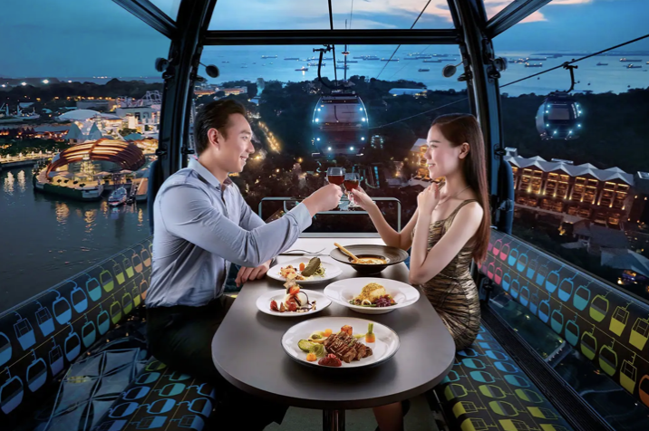 케이블카를 타고 센토사섬에 가서 90분 동안 프라이빗 4코스 식사를 즐기실 수 있어요. 메뉴는 특정 식이 요구 사항에 맞추어 제공될 수 있어요. 연어알과 타르트 라즈베리 드레싱을 곁들인 왕새우 애피타이저를 맛본 후 등심 그릴 스테이크와 에다마메 퓌레를 곁들인 아몬드 크러스트 농어로 이어지는 메뉴를 추천해드릴게요.