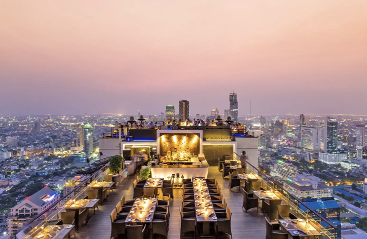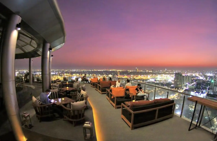 태국 방콕 여행 루프탑 바 야경 선셋 일몰 핫플 전망대 명소 추천 베스트 열 번째! 이 야외 바 겸 레스토랑은 방콕의 번화한 거리 위 61층에 자리하여 웅장한 도시 풍경을 내려다보고 있어요.