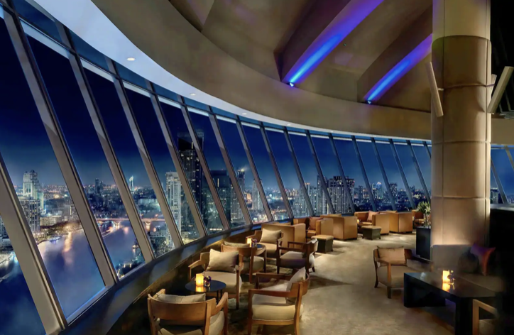 360도로 펼쳐지는 경치 때문에 도시 밖에서 손님들이 꾸준히 이곳을 찾아오죠. 가장자리에 원형 바가 마련되어 있고 높이가 63층인 이곳에 차오프라야강 위로 해가 질 무렵에 가보세요.