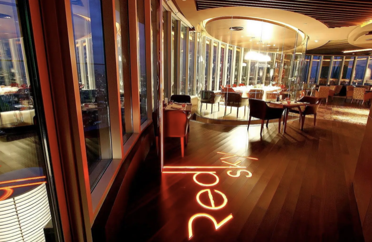전용 엘리베이터와 시크한 화이트 바탕에 화이트 디자인으로 아래에 있는 레드 스카이보다 친밀하고 세련된 분위기를 느낄 수 있어요. 중앙에는 큰 원형 바가 있고 밤새 색상이 바뀌고 사진에 멋진 대비 효과를 주는 거대한 조명 아치가 있어요.