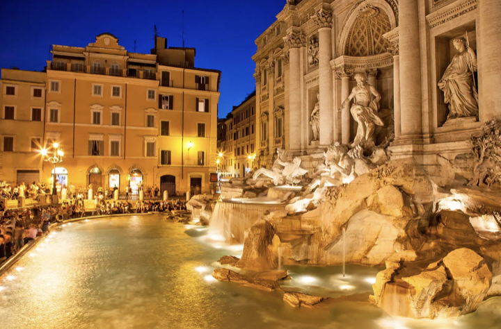 이탈리아 로마 여행 야경 야간 밤 볼거리 명소 추천 베스트 여덟 번째! 트레비 분수는 세계에서 가장 유명한 분수대 중 하나예요. 수로를 통해 물이 공급되는 트레비 분수는 니콜라 살비가 설계하고, 1762년에 주세페 판니니가 완공했어요. 높이가 26m가 넘고 너비는 약 50m에 달하며, 고대 신을 조각한 섬세한 조각상이 수없이 많이 장식되어 있죠.