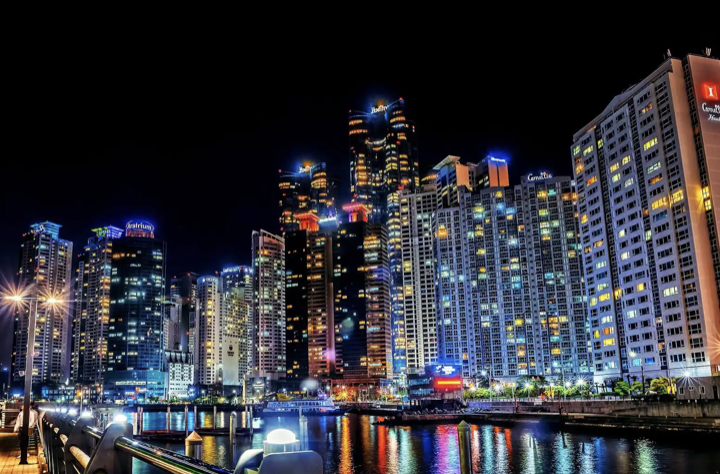 부산 여행 밤 야간 야경 볼거리 놀거리 관광 명소 추천 베스트 일곱 번째! 부산에서 가장 높은 건물들이 모여 있는 해운대는 낮에도 좋지만, 밤에는 더욱 화려하고 아름답기로 유명해요. 조용한 밤바다와 화려한 고층 건물의 대비가 환상적인 분위기를 만들어 내요.