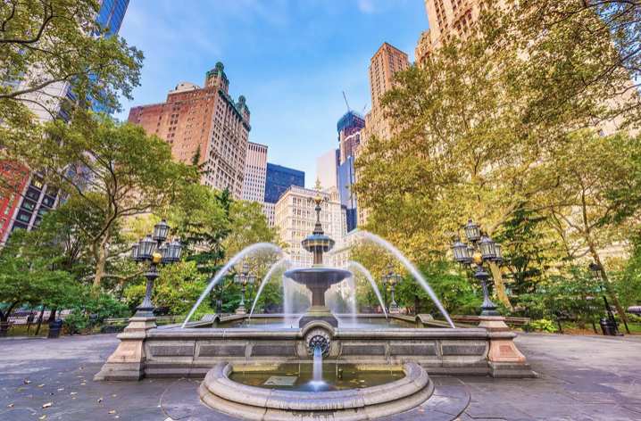 뉴욕 여행 공원 자연 산책 명소 가볼만한곳 추천 베스트 두 번째! 시티홀 공원은 잠시 앉아서 뉴욕의 아름다운 건물들을 감상해볼 수 있는 멋진 곳이에요. 공원은 작은 편이지만 들어서자 마자 상징적인 포토존을 금방 알아볼 수 있을 거예요. 로어 맨해튼을 걷다 보면 눈에 잘 띄는 곳이죠.