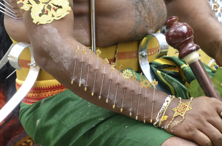 신자들은 카바디에 못과 꼬챙이를 연결해서 몸에 꽂고, 신자의 몸으로 마차와 같이 끌고 다니기도 합니다. 카바디를 이고 가는 신자들이 행진하는 길을 따라 사람들이 모여들어 기도를 외우고 박수를 치며 응원도 하는데요. 논리로는 설명할 수 없는 매혹적인 의식이 하루 종일 계속되고, 아무나 볼 수 있어요.
