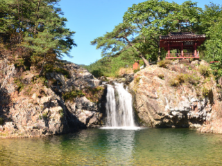상주 가볼만한곳 베스트 10 여섯 번째! 천황봉에서 길게 뻗어 내려온 산과 물이 한 용소로 깊숙이 떨어지니 이것이 바로 장각동구의 장각폭포이다. 폭포의 높이는 6m가 넘으며 수량이 많아 산천을 진동시키는 검푸른 용소는 그 깊이를 헤아릴 수 없으며 낙수의 여파로 빙글빙글 돌고 있는 수면을 보고 있으면 금방 용이라도 치솟아 오를 것 같은 느낌을 준다.
