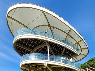 상주 가볼만한곳 베스트 10 두 번째! 상주보에서 경천대까지의 4~5km 길이의 풍경을 파노라마처럼 바라볼 수 있는 학전망대는 공모를 통해 설계됐으며 전체적으로 학 모양을 형상화한 것이다. 이 학전망대는 바위 위에 내려앉은 철새처럼 가볍고 산뜻한 느낌을 주며 산 중턱에 위치하여 주변의 숲과 자연스럽게 어울려 하나된 경치를 이루고 있다.