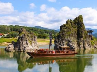 충북 단양 가볼만한곳 베스트 10 여덟 번째! 도담삼봉은 당당한 풍채가 돋보이는 남편봉을 중심으로 아담한 모양새의 처봉과 첩봉이 양옆을 지키고 있는데 특히, 남편봉은 삼도정이라고 불리는 육각정자를 멋들어지게 쓰고 있어 더욱 그윽한 운치를 자아낸다.