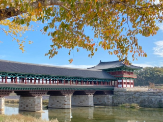 11월 경주 가볼만한곳 베스트 10 두 번째! 남천(문천) 위를 수놓고 선 그림과도 같은 목조교량 월정교이다. 신라시대 월성과 남쪽 지역을 이어주는 통로였고, 원효대사와 요석공주의 사랑이야기가 얽혀 있는 사랑의 길이기도 한다.