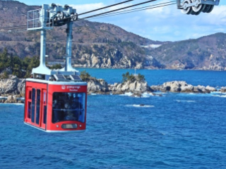 삼척 가볼만한곳 베스트 10 두 번째! 삼척시 근덕면 용화리에서부터 장호리까지 운행하는 삼척해상케이블카는 용모양의 역사 2개가 서로 마주보고 있는 형태이다. 길이 874m, 고저차(역사간 높이차이) 21m의 중간 철탑이 없는 구간을 Sunshine호와 Sunrise호가 바다 위를 가로지르며 운행한다. 삼척해상케이블카를 타고 천혜의 자연절경과 청정해변을 감상할 수 있다.