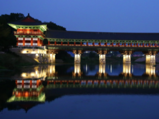 경주 가볼만한곳 베스트 10 첫 번째! 남천(문천) 위를 수놓고 선 그림과도 같은 목조교량 월정교입니다. 신라시대 월성과 남쪽 지역을 이어주는 통로였고, 원효대사와 요석공주의 사랑이야기가 얽혀 있는 사랑의 길이기도 합니다.