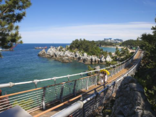 동해 가볼만한곳 베스트 10 아홉 번째! 일출로 유명한 추암촛대바위가 자리하고 있는 추암해변에 2019년 6월 새롭게 신설된 72m 길이의 해상출렁다리로 국내에선 유일하게 바다 위에 지어진 출렁다리이다.
